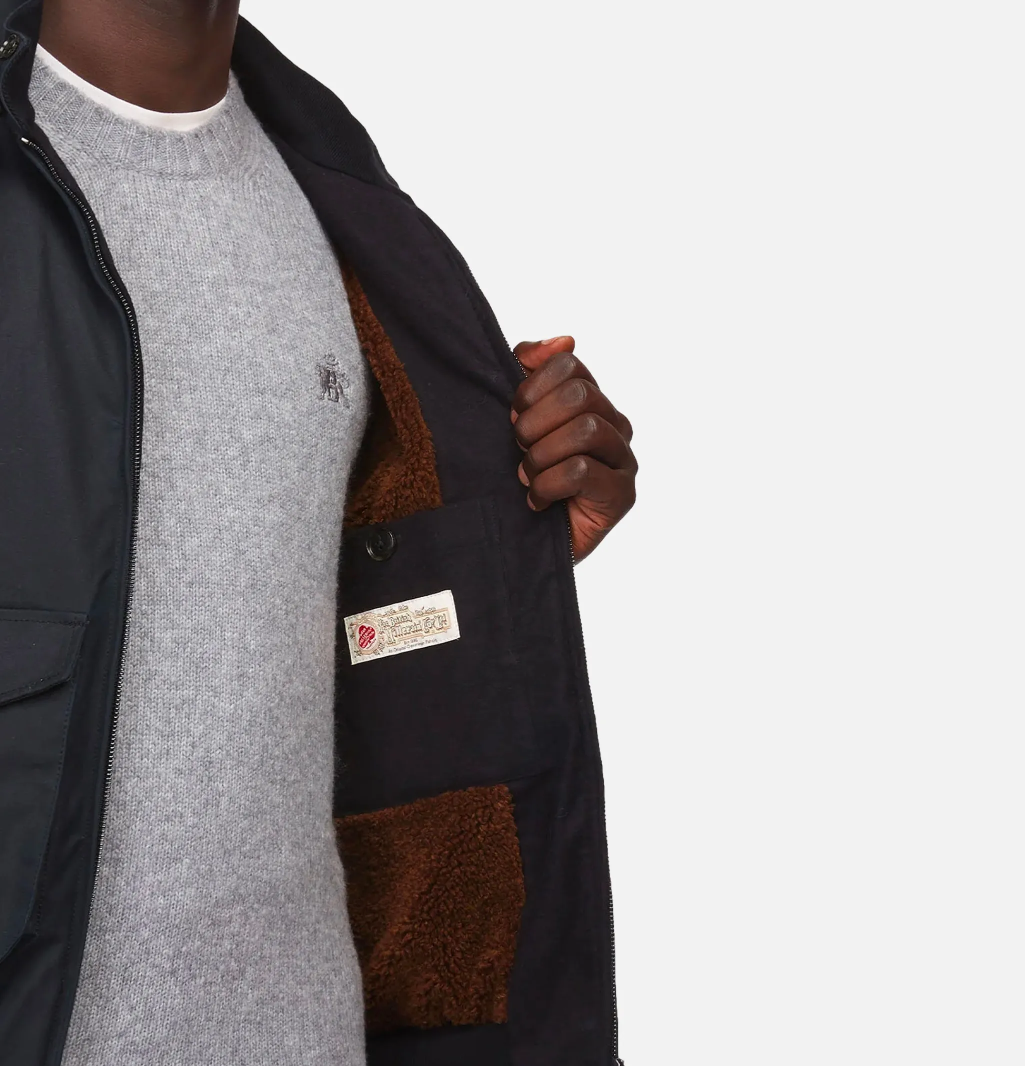 - Poche intérieure de couleur contrastante avec fermeture à bouton unique et étiquette British Millerain