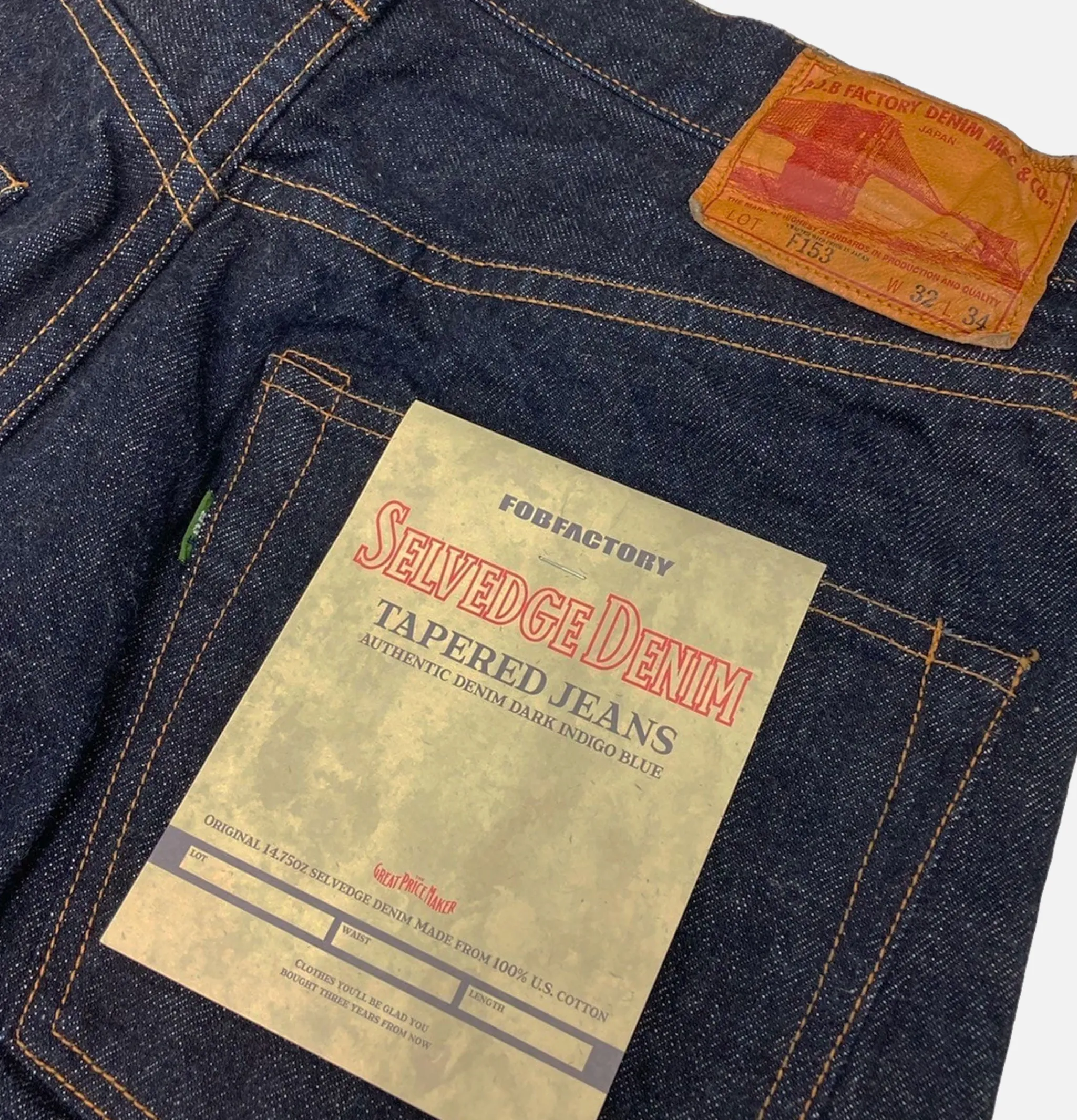 - Denim selvedge original de F.O.B FACTORY, 14.75 oz, fabriqué en 100% coton américain.